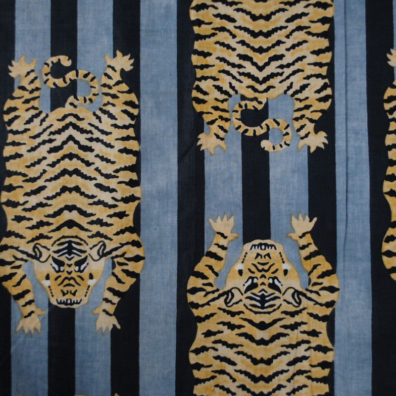 Magnificent Indian hand-produced using natural dyes. On a light, soft and comfortable cotton veil. A big tiger pattern (20cm) on large light and dark gray blue stripes.