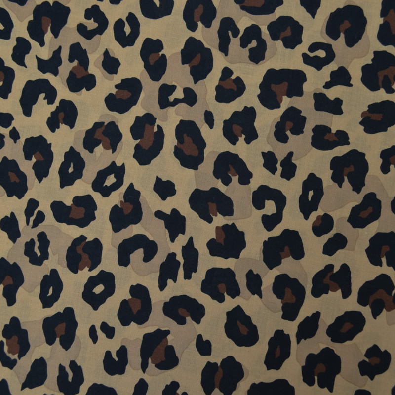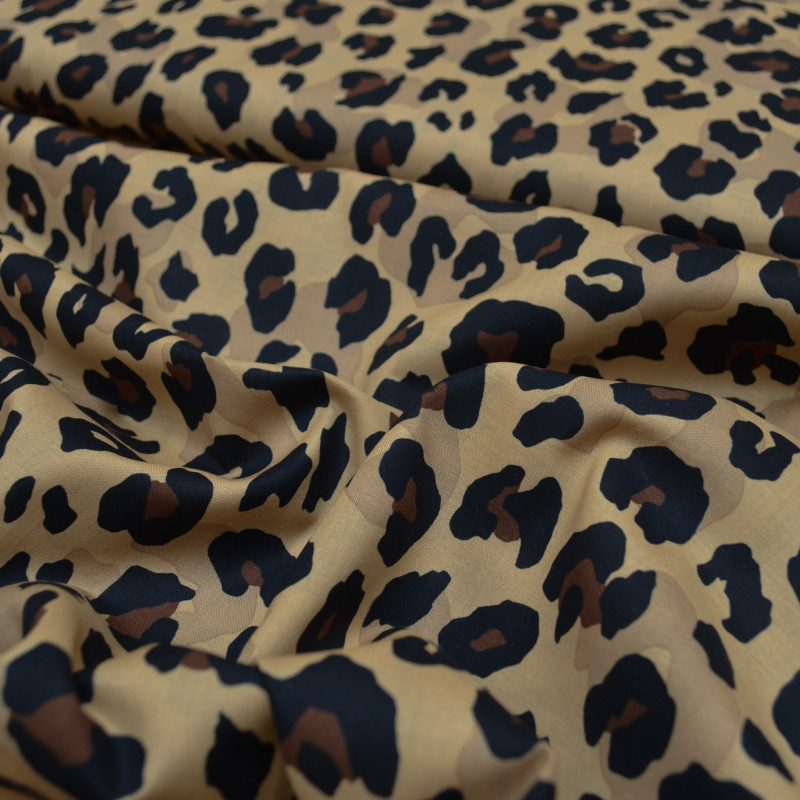 Cotton voile with a black and brown leopard pattern on a camel background. A classic in a light and flowing cotton, ideal for sewing a blouse or an accessory, and will match many fabrics as a lining.