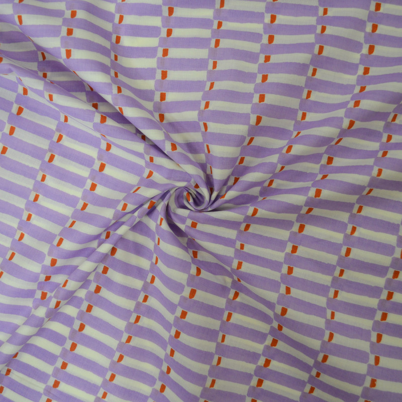 Cotton poplin with a lilac and red geometric pattern affixed by hand to ecru poplin using the traditional block print technique (like many Indian fabrics). A pretty pattern, on a soft fabric that adds structure to a blouse, shirt, dress or accessory.