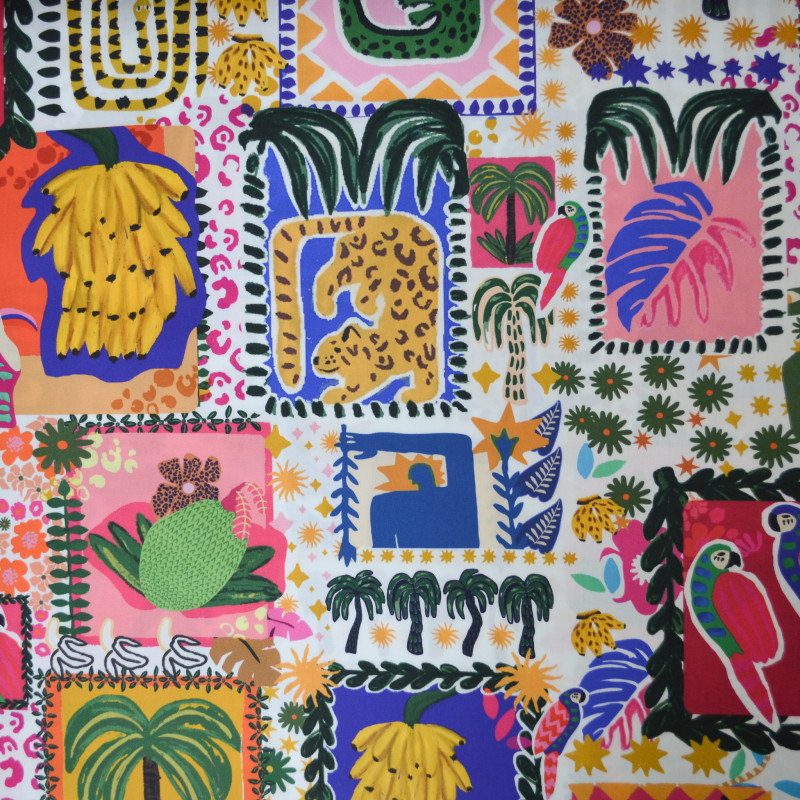 Cotton satin with an eclectic pattern mixing frames of life in the tropics with animals, plantations and fruits of all colors in an explosion of colors. A pretty multicolored patchwork, on a smooth-touch fabric that will be perfect as a blouse, shirt, dress, skirt, etc.