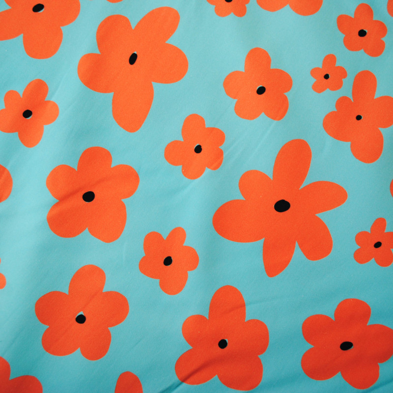 100% cotton canvas with a floral print of coral daisies on a sky blue background. Its weight gives it a beautiful structure, allowing the fabric to be suitable for sewing accessories, pants, shorts or jackets.