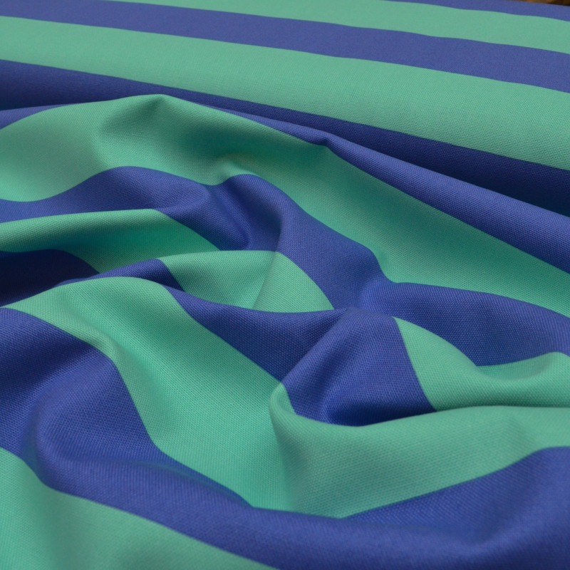 100% cotton canvas with large blue and green mint stripes. Ideal for sewing accessories, mid-season jackets, flexible pants.