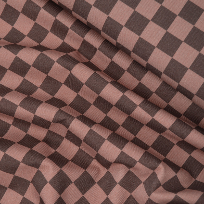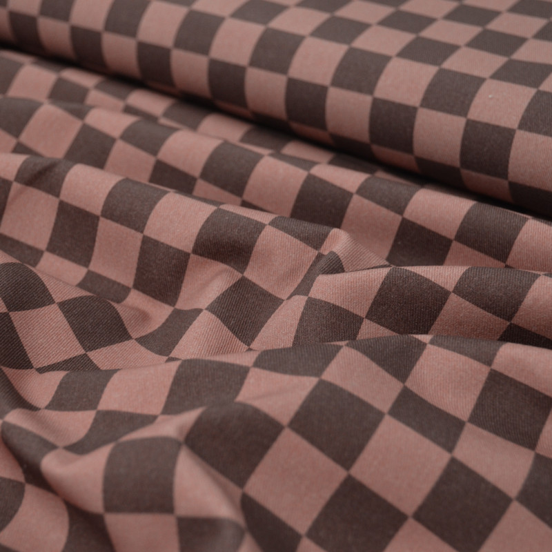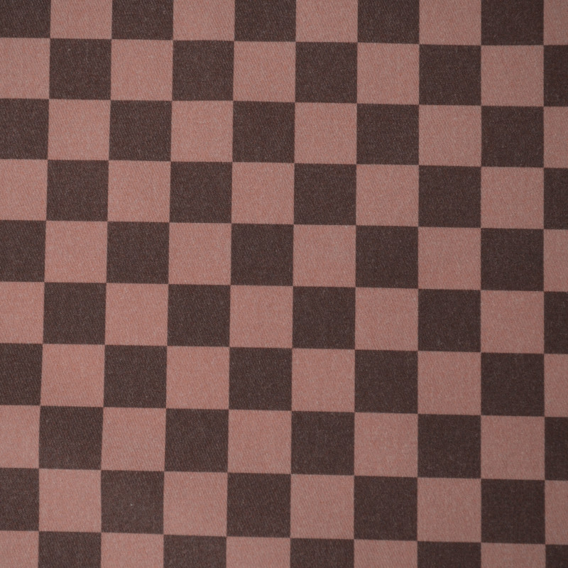 Tuesday is the glossy brown and dark brown checker pattern printed on a twill weave gabardine. To be used as you wish: jumpsuit, pants, skirt, jacket, accessory, bag, etc.