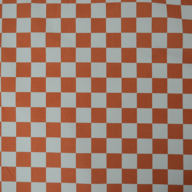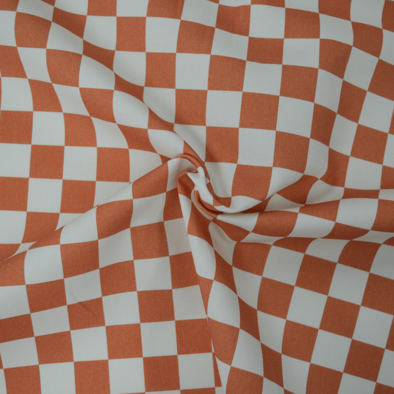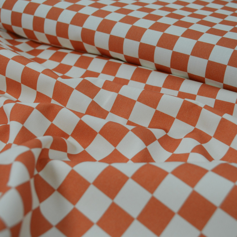 Friday is the terracotta and off-white checker pattern printed on a twill weave gabardine. To be used as you wish: jumpsuit, pants, skirt, jacket, accessory, bag, etc.