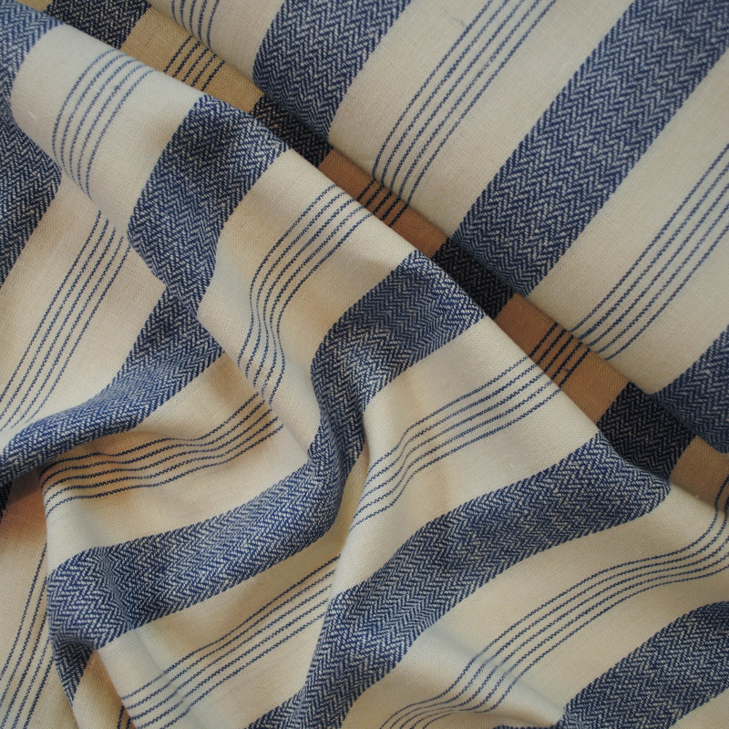 A classic striped linen in a beautiful linen and viscose weaving. The motif of washed blue scratches alternates large bands and fine lines on a natural ecru linen. We appreciate its weight and linen texture for the seam of comfortable and breathable pieces such as a blouse, a dress or a pants.