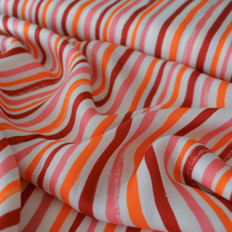Linen viscose with a very flexible and natural touch offering a pattern with burgundy, orange and pink stripes on a white background. Imperfect stripes give a beautiful dynamic to the fabric. Both light and tramed, it allows you to imagine the making of blouses, dresses or any other summer piece.