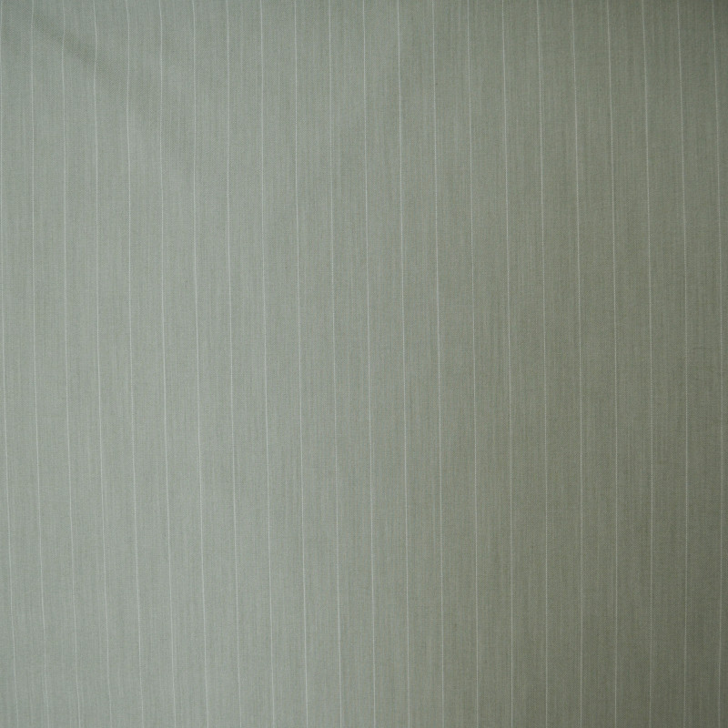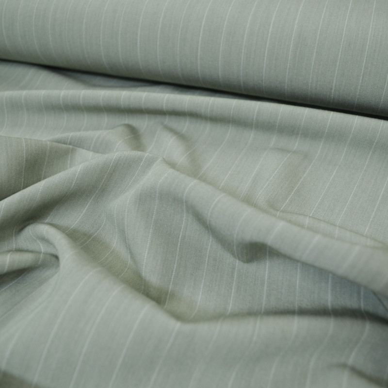 Medium twill with fine ecru stripes available in slightly textured mint green. It offers good hold and elasticity, while having a weight suitable for sewing pants, blaser and any piece requiring a little weight.