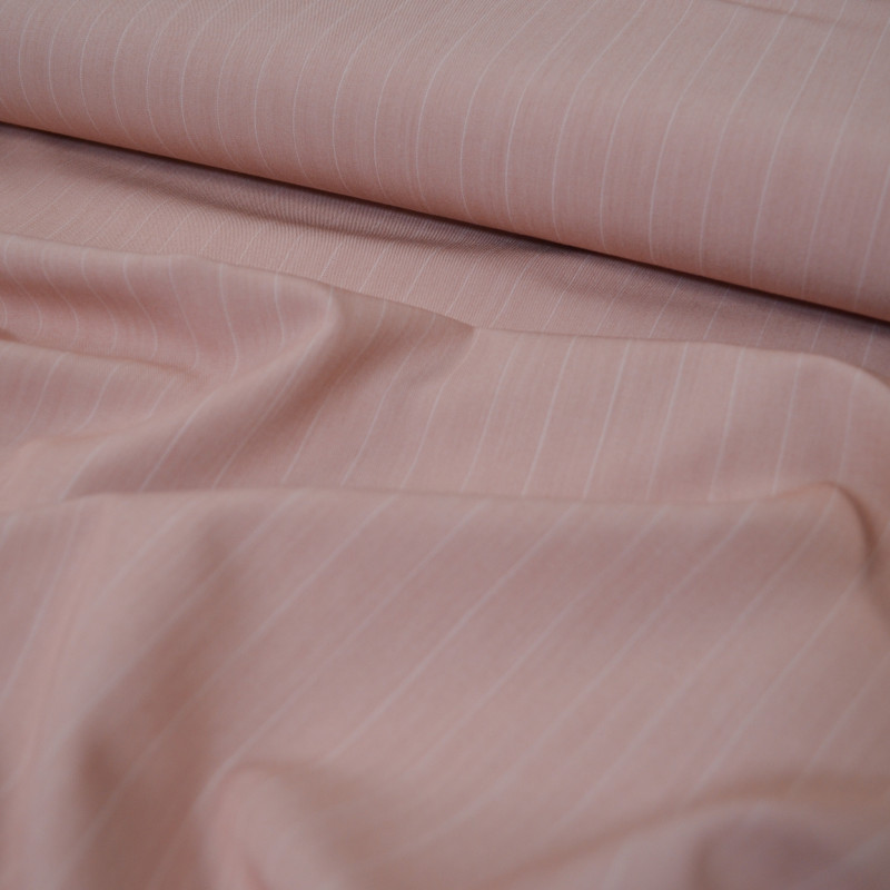 Medium twill with fine ecru stripes available in slightly textured light pink. It offers good hold and elasticity, while having a weight suitable for sewing pants, blaser and any piece requiring a little weight.