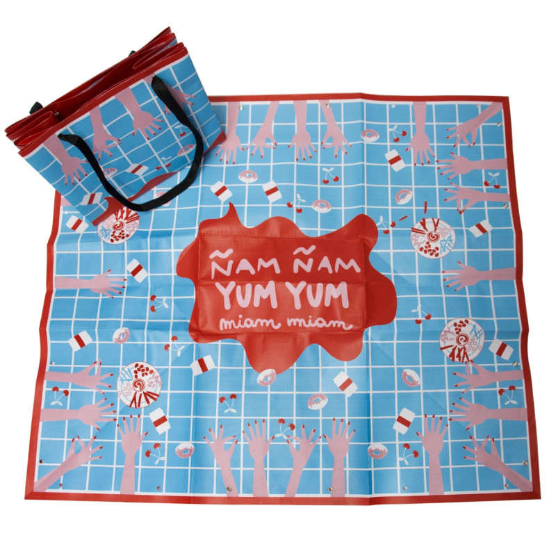 Ce kit comprend un sac avec poignées qui, une fois déplié, devient une nappe de pique-nique.