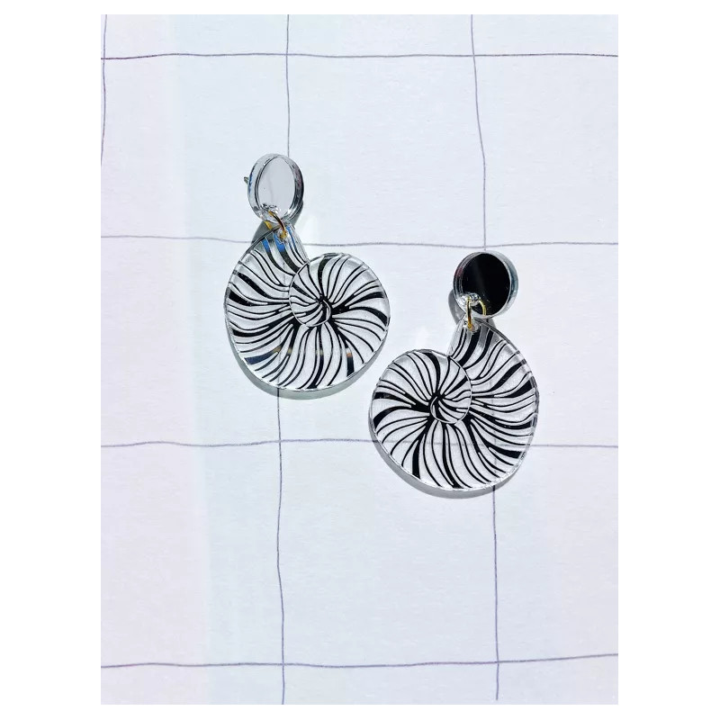 Boucles d'oreilles en plexiglass en forme de coquillages miroirs.