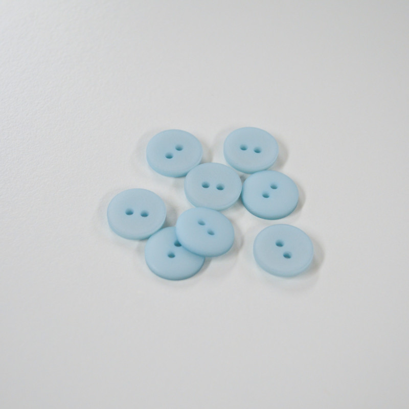 Bouton plat satiné à deux trous, au diamètre de 15mm. Décliné en bleu layette légèrement irisé.