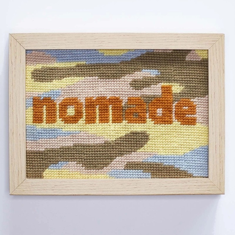 Of course on peut mettre du camouflage sur un canevas, c’est même canon et ça change du canevas de mémé. Cette illustration prône ton esprit nomade comme un mantra à broder, à offrir, à encadrer pour ne pas oublier que nous sommes des êtres mobiles.