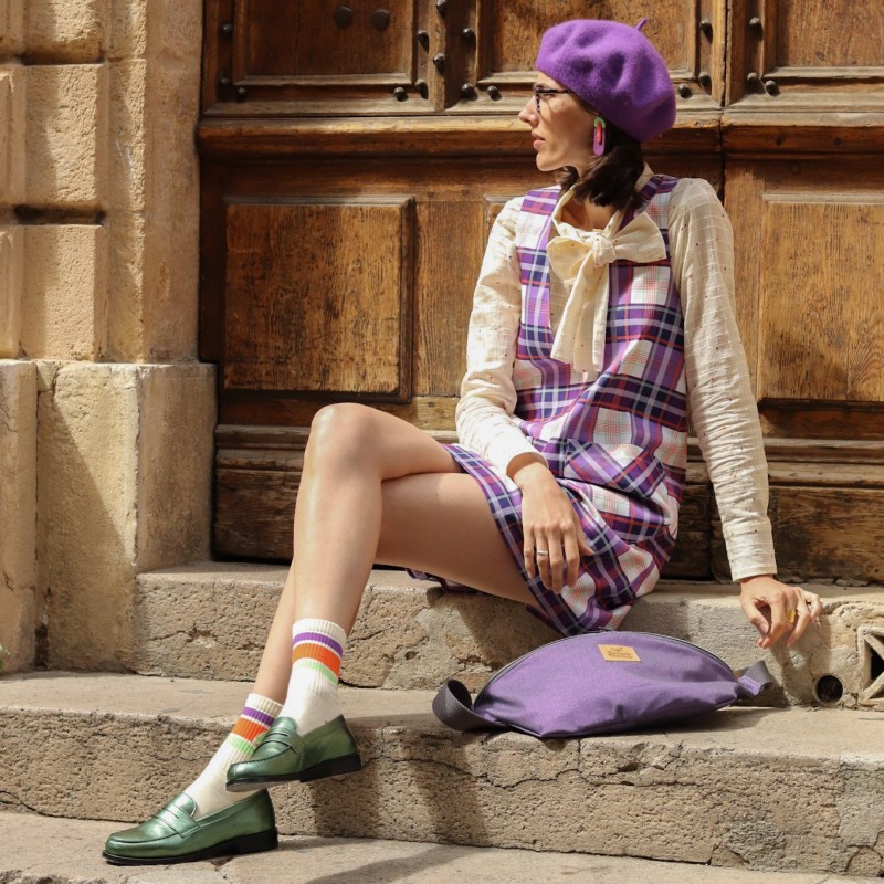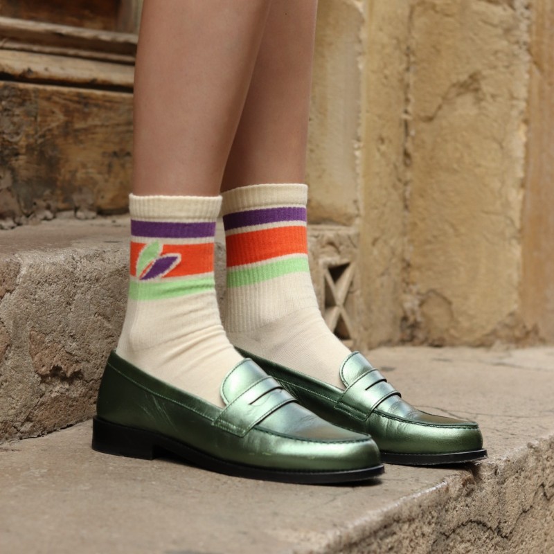 Les chaussettes sont issues de la collection MAXImaliste : Avec la nouvelle collection Calissone, la rentrée sera Sporty Chic ! Des tissus aux couleurs audacieuses, des classiques tartans, rayures et plumetis revisités. Du violet, du vert et du orange pour un style complètement MAXImaliste !
