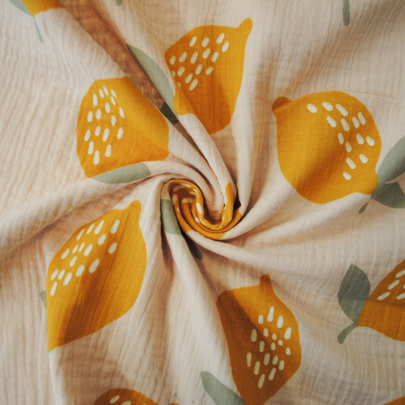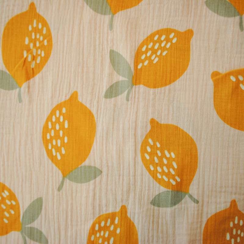 Double gaze de coton au motif répété de citrons jaunes sur un fond beige. Faites le plain de peps et d'énergie dans ce bel imprimé aux tonalités pastels.