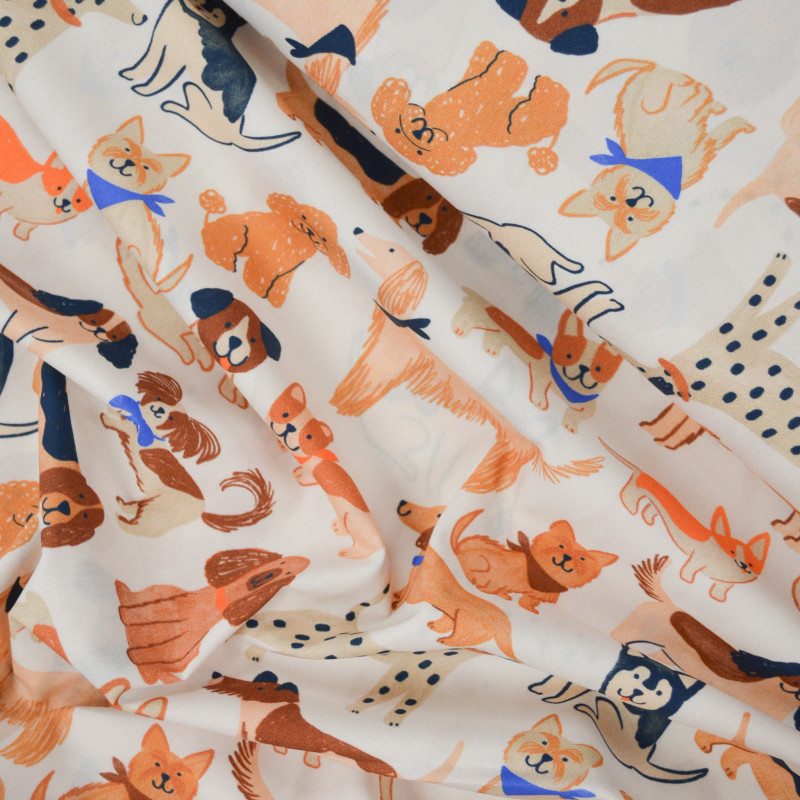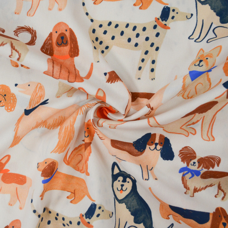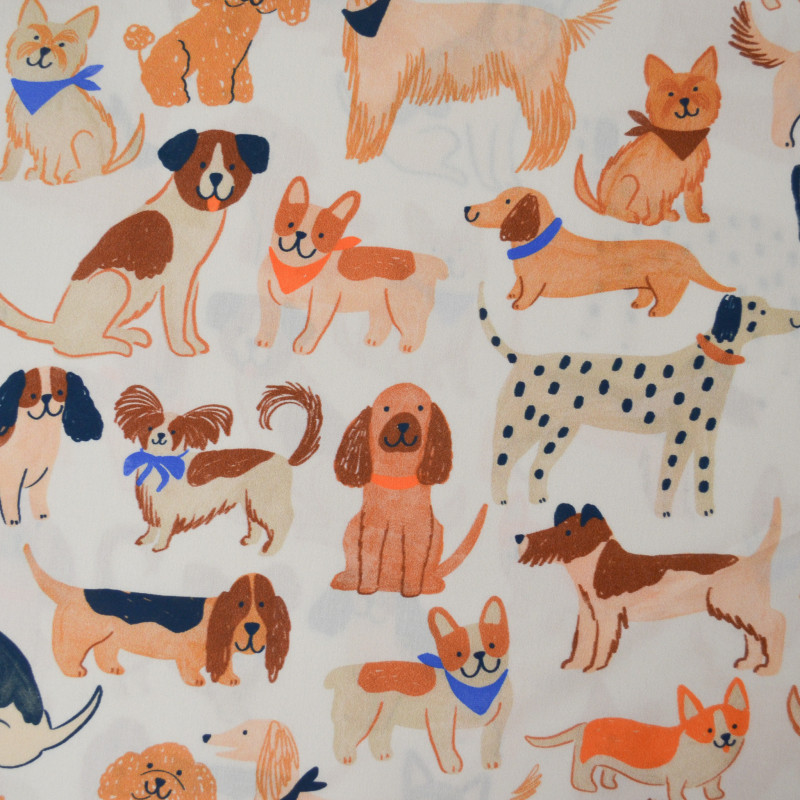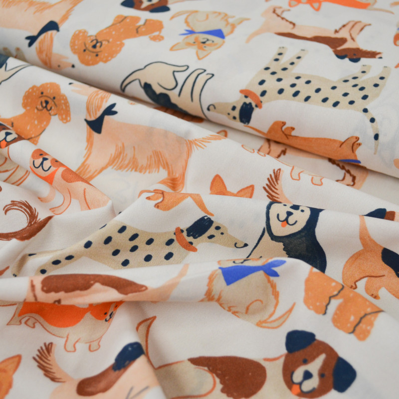 Popeline de coton à l'imprimé qui a du chien sur un fond crème, à la fois rigolo et enfantin. Ce tissu polyvalent sera idéal pour la couture d'un top ou d'un accessoire.