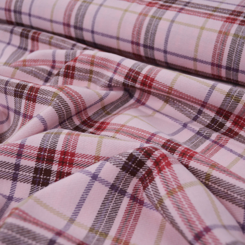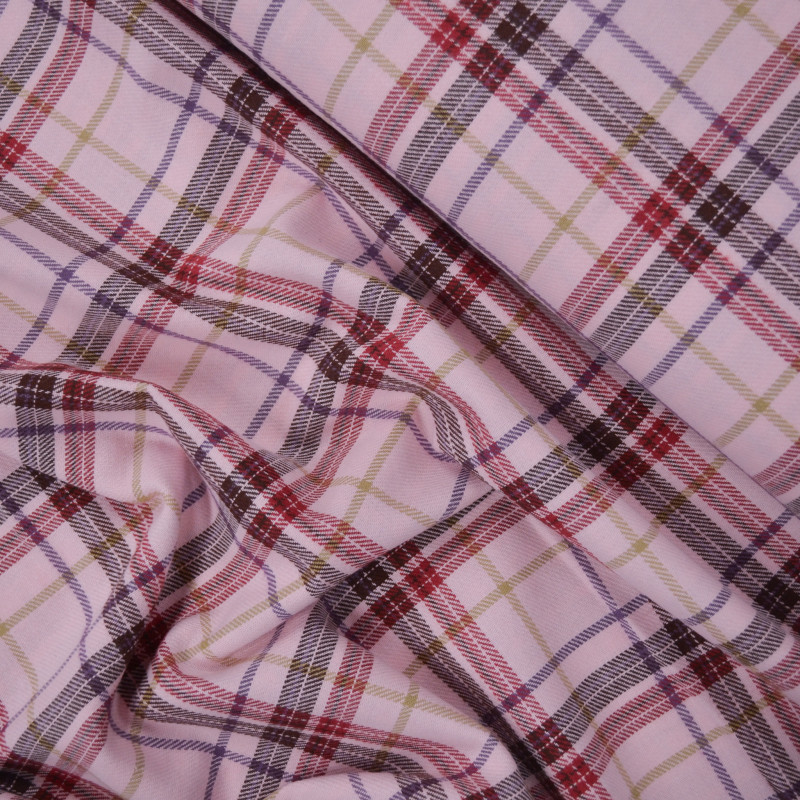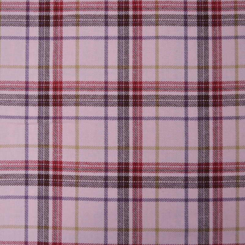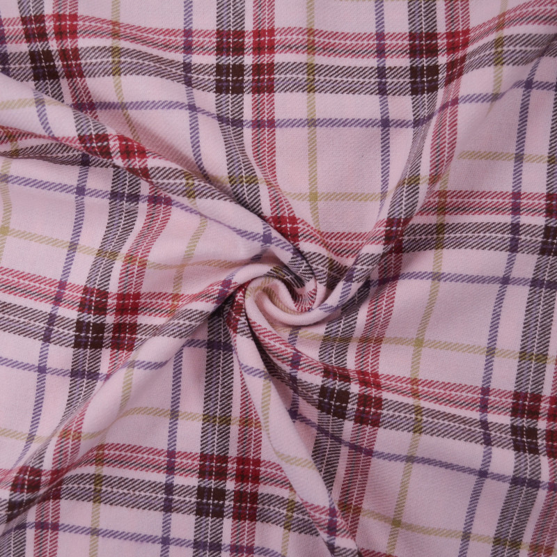 Flanelle de coton au motif tartan tissé avec des rayures rouges, violettes, marrons et beiges sur un fond rose. Alliant douceur, poids moyen et structure, il sera votre parfait allier pour la couture d'une pantalon, d'une combi, d'une chemise oversize, d'une veste, etc.