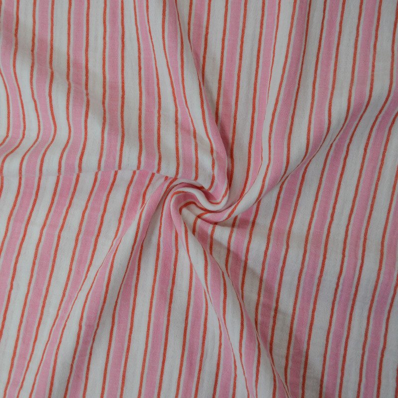 Double gaze de coton écru au motif de rayures oranges et roses tissées. Une jolie double gaze, douce au rendu intemporel, que vous déclinerez facilement en chemise, top ou linge de maison.