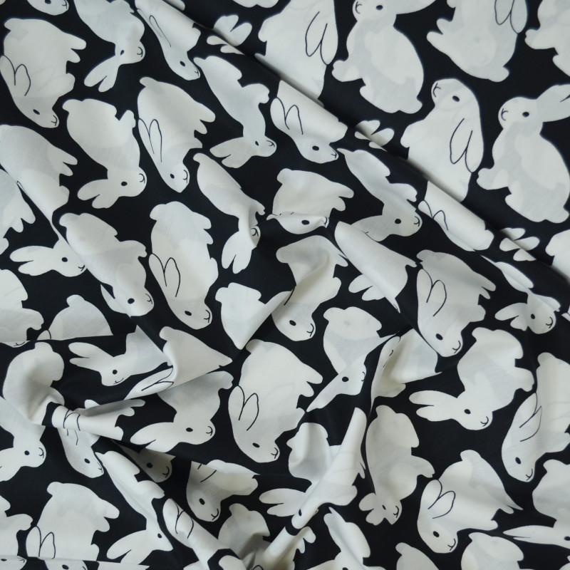 Popeline de coton au motif de lapins blancs sur un fond noir. Un imprimé à la fois enfantin et figuratif qui se porte pour petits et grands. Une belle popeline 100% coton qui se déclinera en robes, chemises, top ou accessoires.