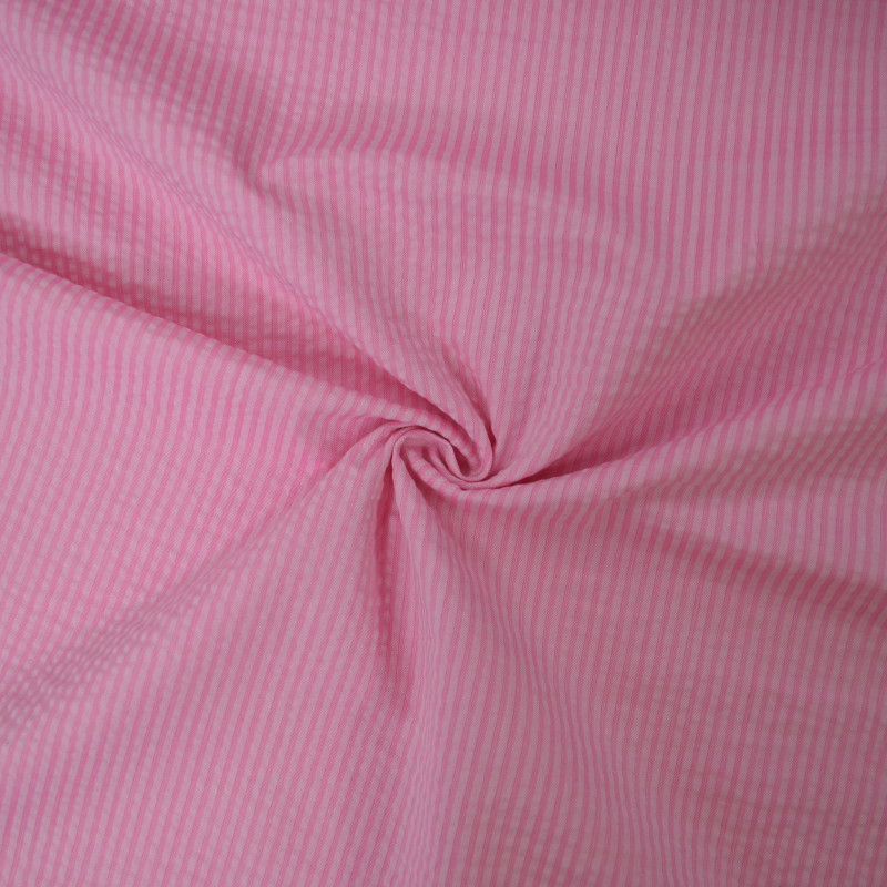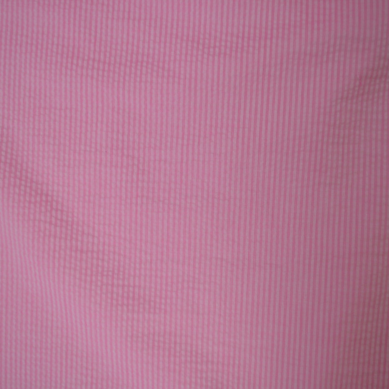 Coton à rayures rose au tissage seersucker. Un beau tissu 100% coton à la fois lumineux et texturé, idéal pour la confection d'un chemisier, une robe, une jupe.