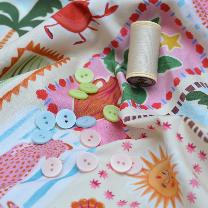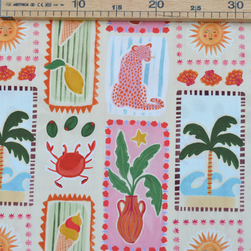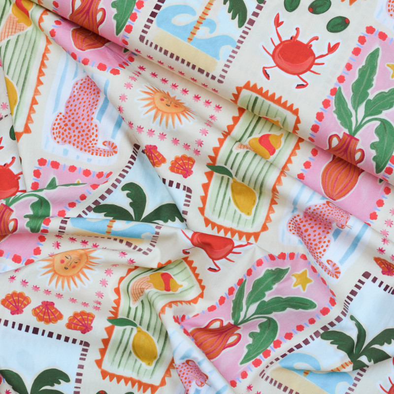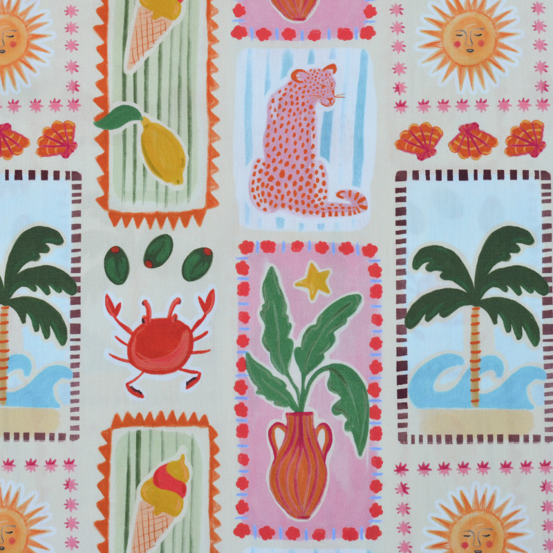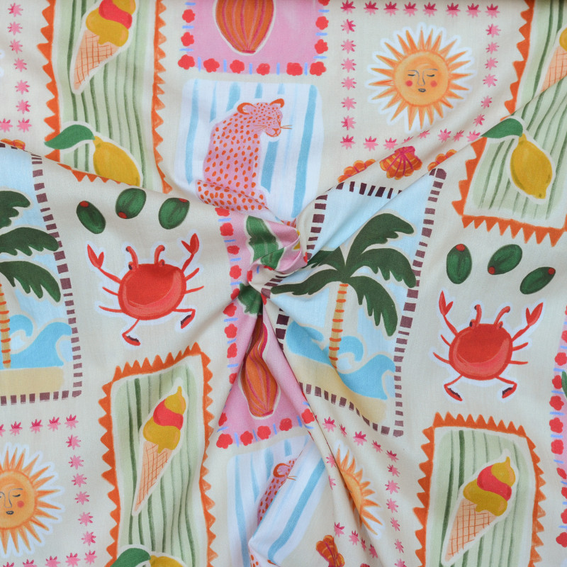 Popeline de coton au motif exclusif avec de multiples dessins colorés (soleil, glace, léopard, crabe, citron, palmier, etc.) sur un fond beige clair. Une véritable ode à l'été et à ses meilleures vibes qui vous fera voyager. Un motif exotique et chaleureux sur une belle popeline de coton produite en France. Ce tissu vous permet d'imaginer notamment une chemise, un short, un gilet sans manche ou une robe.