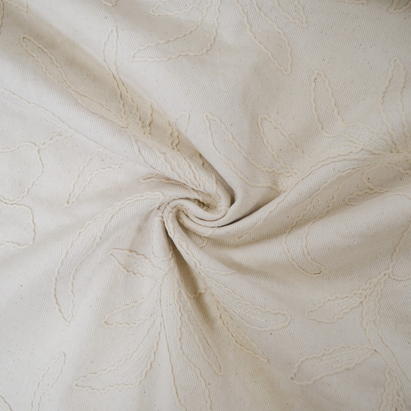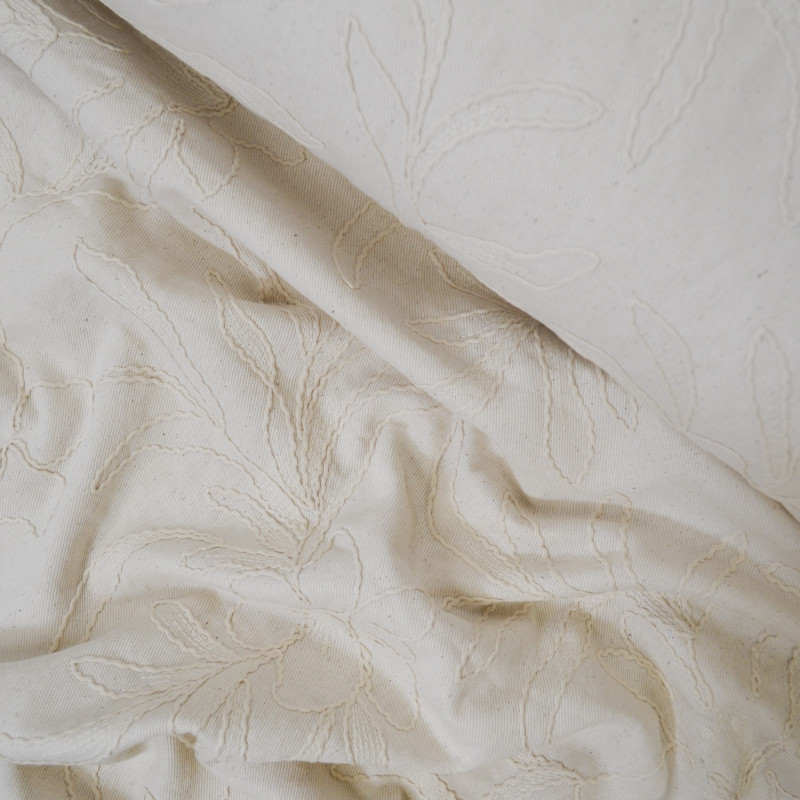 Gabardine 100% coton au motif floral brodée ton sur ton écru naturel. Un très beau tissu à la fois structuré et doux qui se déclinera parfaitement en veste, combinaison, pantalon, etc.