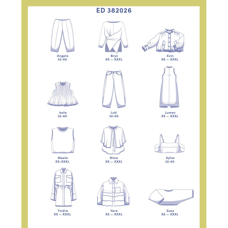 Découvrez des patrons à la fois festifs et faciles à porter. Angela et Luki revisitent le pantalon classique avec une touche contemporaine, tandis que Bryn et Isola jouent avec les lignes, les plis et l’asymétrie. Lumen et Tindra proposent des pièces élégantes et affirmées, à la fois chic et décontractées, et Yara se distingue par ses volants. Evin, Rima et Zoey montrent comment des détails forts et des coupes ingénieuses peuvent sublimer une tenue, tandis que Maela et Sylva misent sur les superpositions et la transparence.