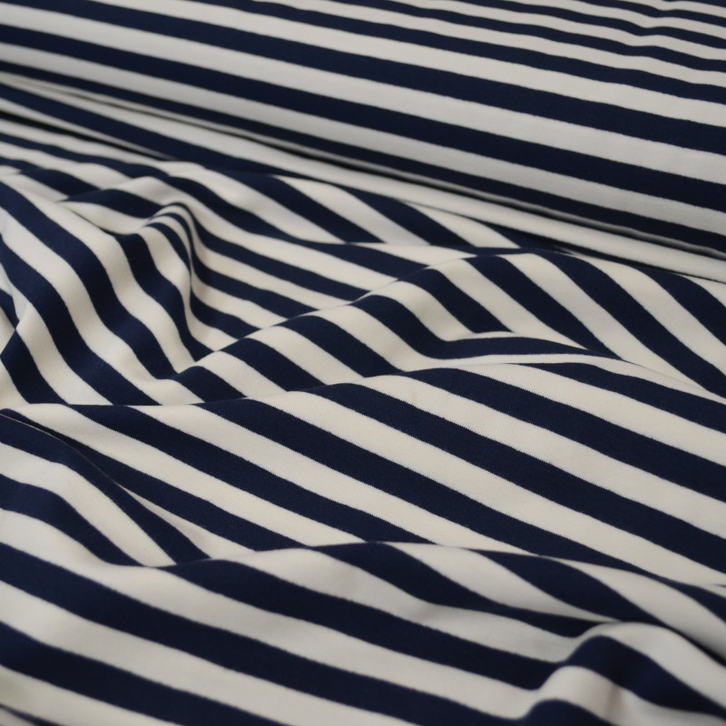 French Terry au motif marinière, décliné en bleu marine et blanc cassé. Un classique que l'on apprécie toujours autant pour la couture d'un top, t-shirt, jupe ou robe...