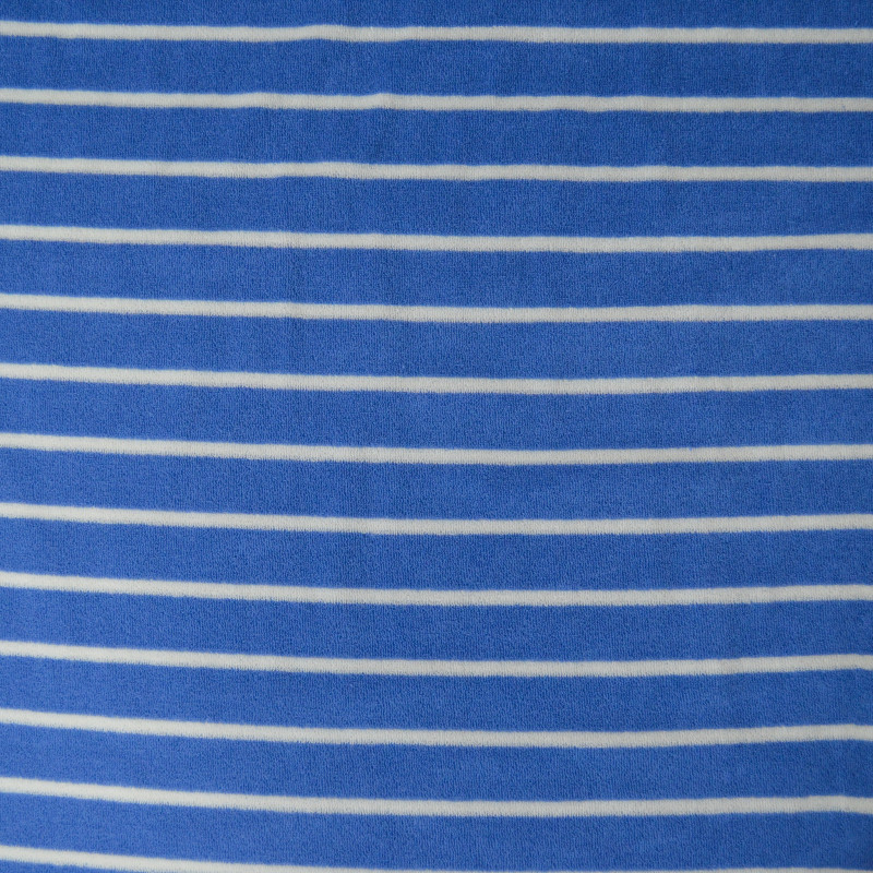 Jersey de coton éponge au motif à rayures écru sur un fond bleu. Tissu incontournable pour son confort, son élasticité et sa douceur, il permet la couture de t-shirt, chemisier, short ou robe parfaitement adaptée pour les beaux jours.