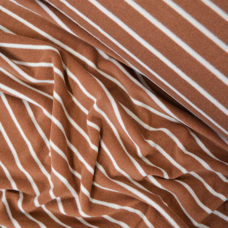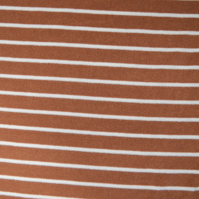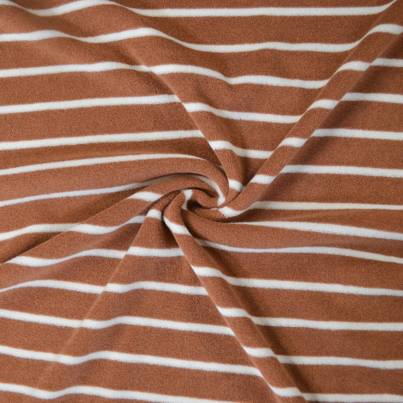 Jersey de coton éponge au motif à rayures écru sur un fond brun. Tissu incontournable pour son confort, son élasticité et sa douceur, il permet la couture de t-shirt, chemisier, short ou robe parfaitement adaptée pour les beaux jours.