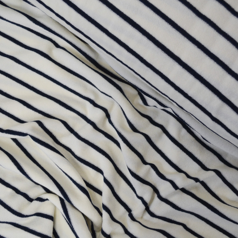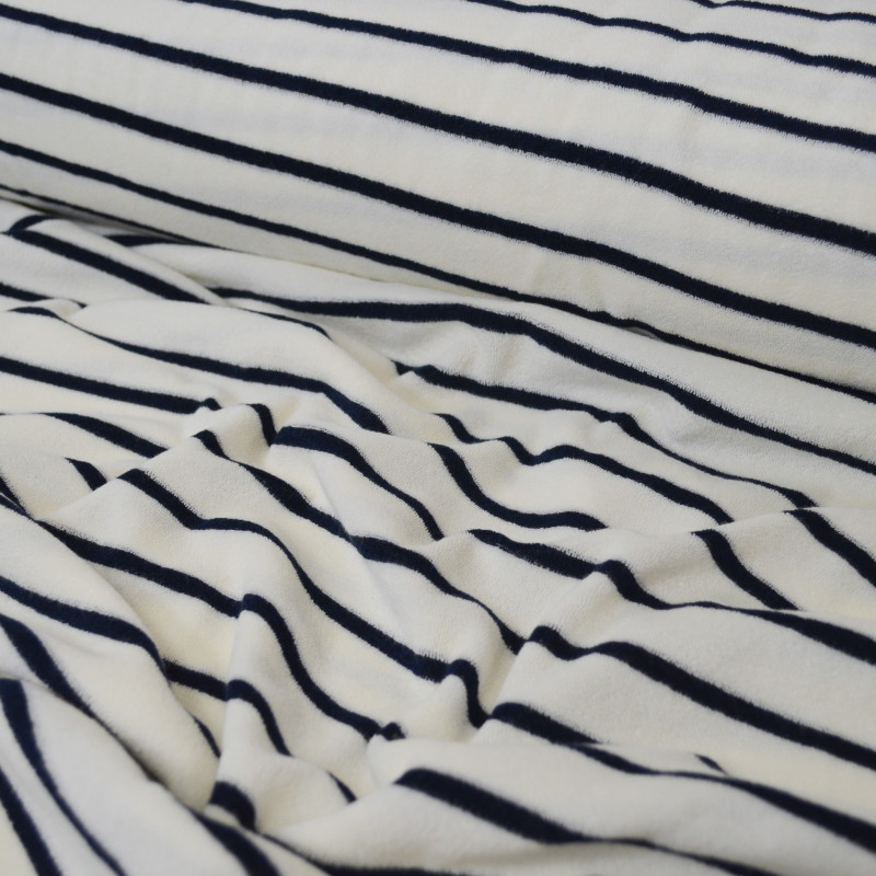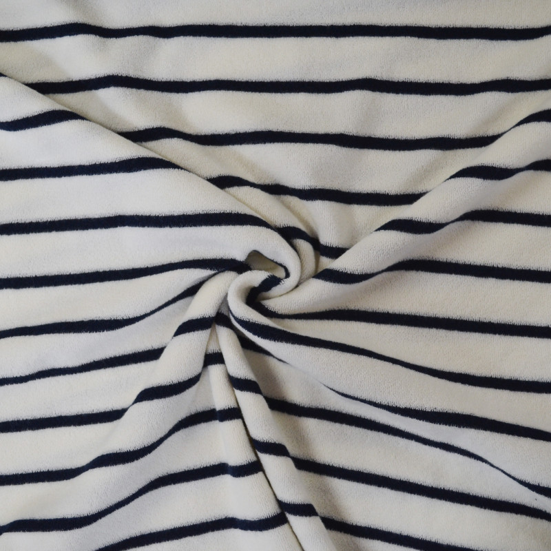Jersey de coton éponge au motif à rayures bleues marines sur un fond écru. Tissu incontournable pour son confort, son élasticité et sa douceur, il permet la couture de t-shirt, chemisier, short ou robe parfaitement adaptée pour les beaux jours.