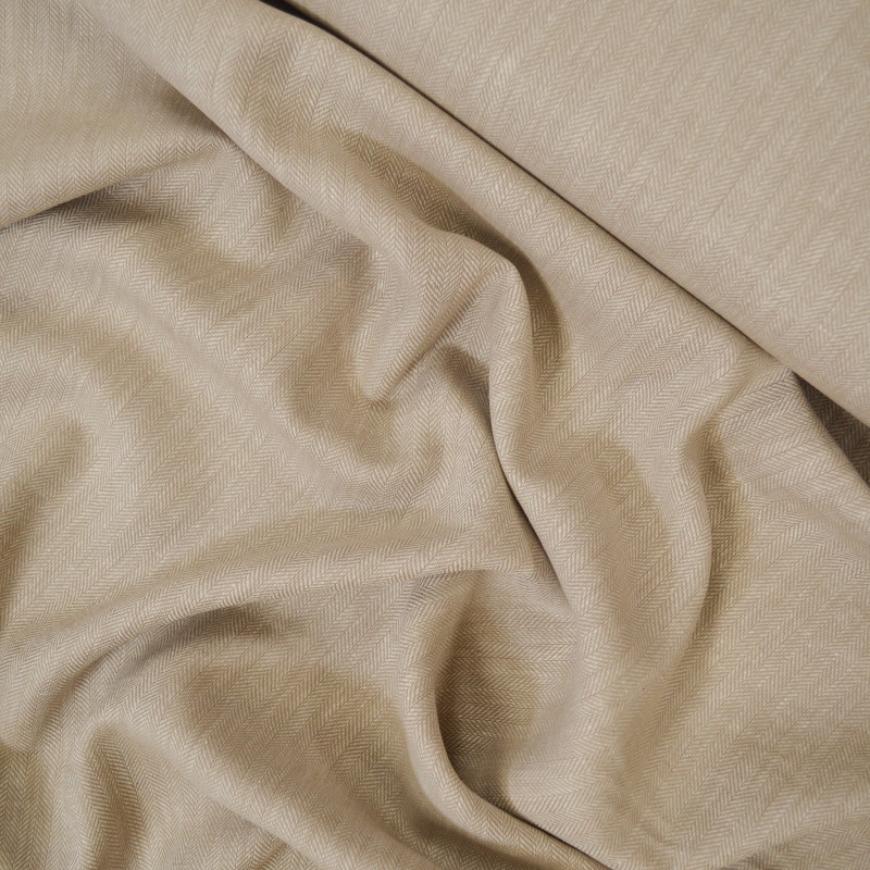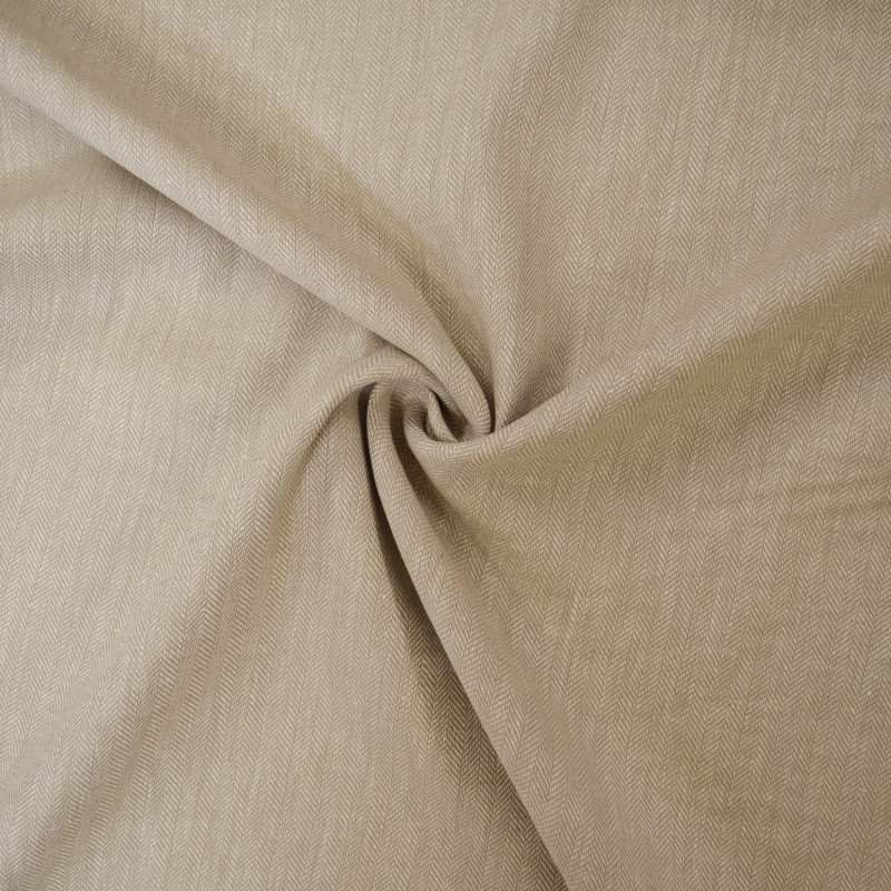 Tissu lin coton au tissage chevron décliné en beige. De poids moyen, il est adapté aux pièces nécessitant de la structure telles qu'un pantalon, une combi, un short ou même une veste légère.