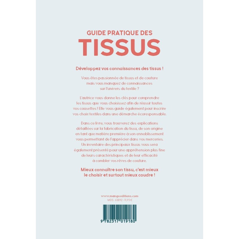 Vous êtes passionnée de tissus et de couture mais vous manquez de connaissances sur l'univers du textile ? L'autrice vous donne les clés pour comprendre les tissus que vous choisissez afin de réussir toutes vos cousettes ! Elle vous guide également pour inscrire vos choix textiles dans une démarche écoresponsable. Dans ce livre, vous trouverez des explications détaillées sur la fabrication du tissu, de son origine en tant que matière première à son ennoblissement vous permettant de l'apprécier dans vos merceries.