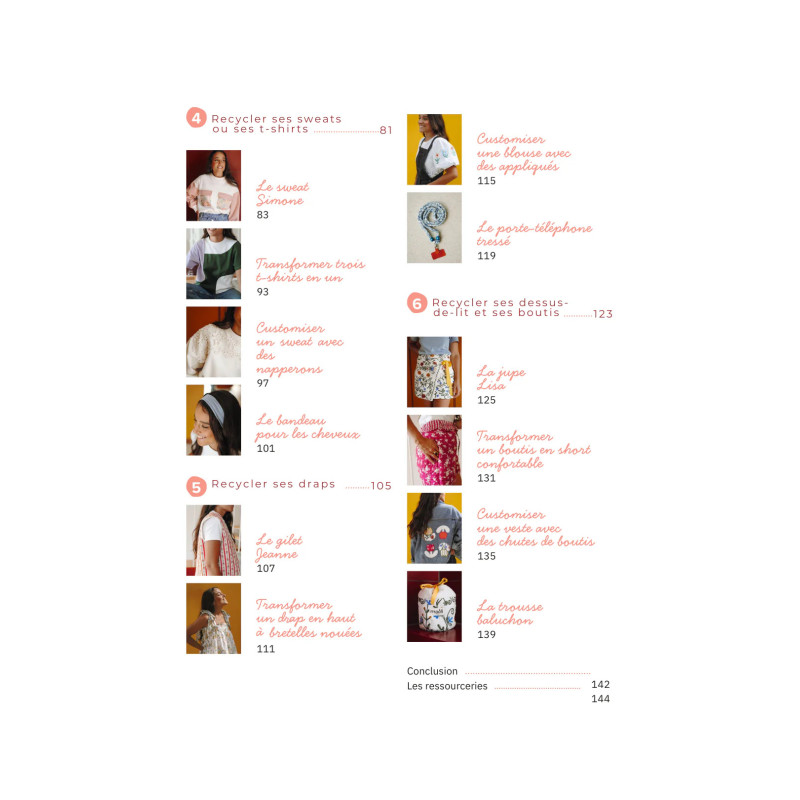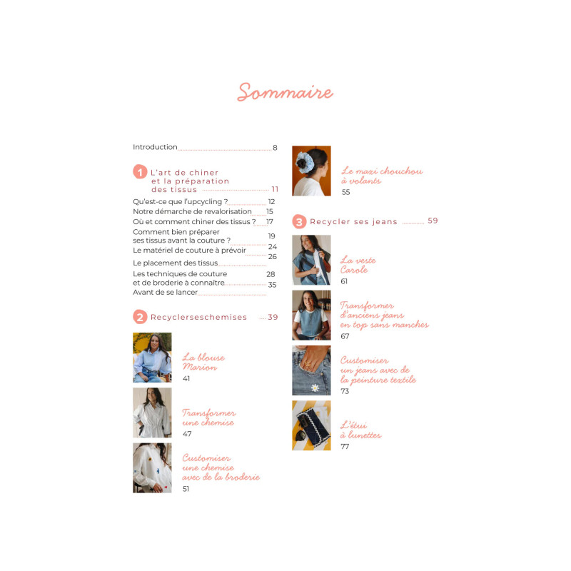 Les projets sont organisés autour de 5 grandes catégories de textiles du quotidien, pour apprendre à transformer facilement les vêtements et tissus que vous avez déjà chez vous :