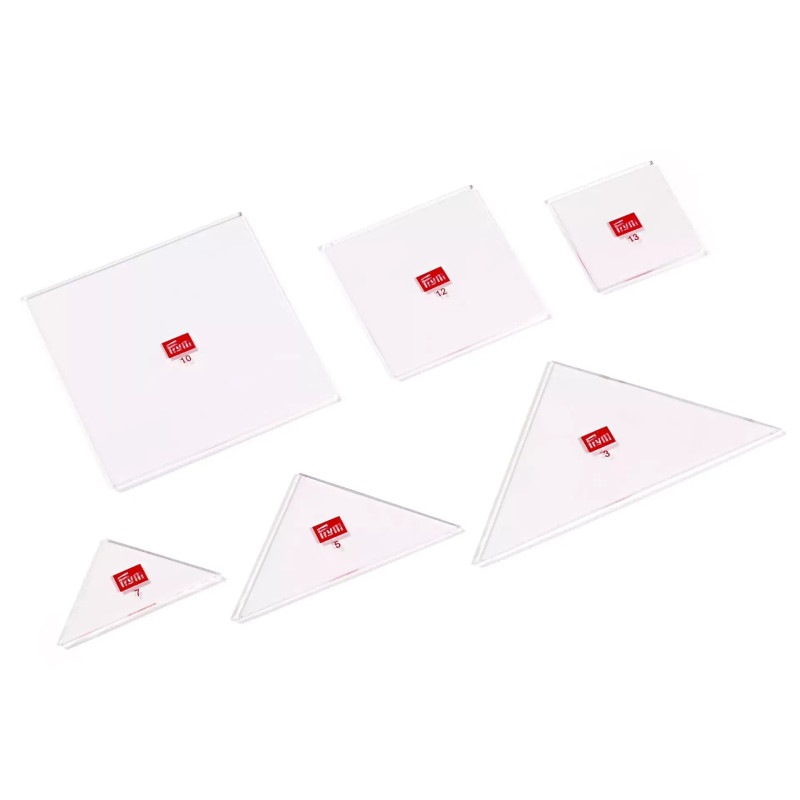 Gabarits patchwork en plastique solide pour confectionner des couvertures et coussins patchwork. Jeu complet de carrés et triangles dans trois tailles différentes.