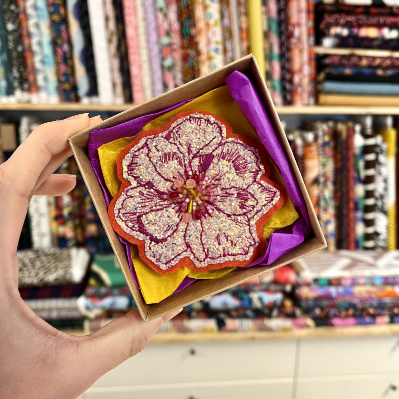 Broche brodée "Anémone" de Marcelle en Provence. Créées à Aix-en-Provence, les broches sont brodées à la main avec coeur, en toutes petites séries.