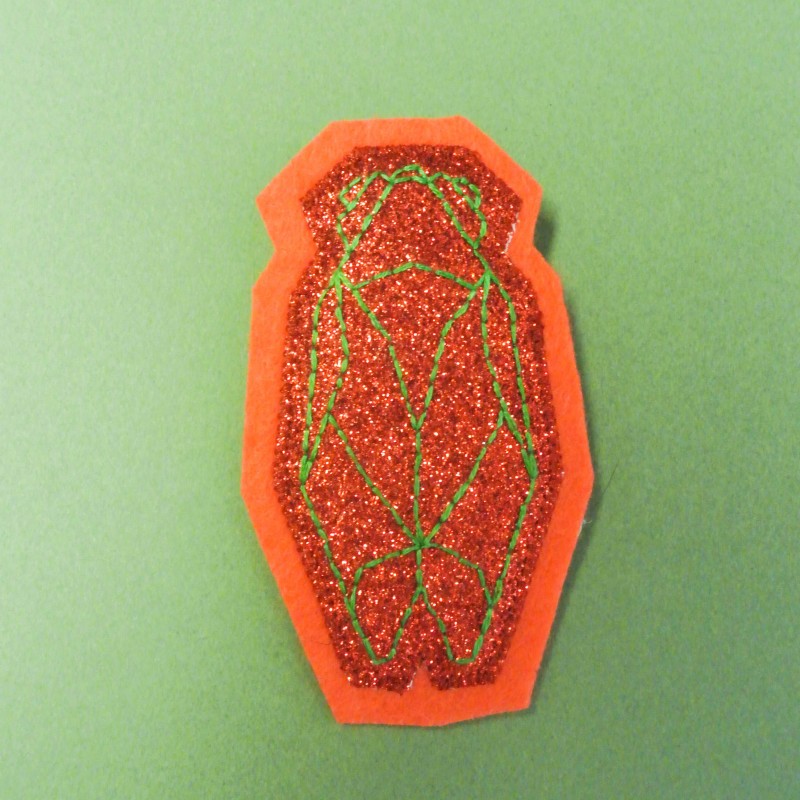 - fond rouge pailleté, broderie verte, tour coquelicot