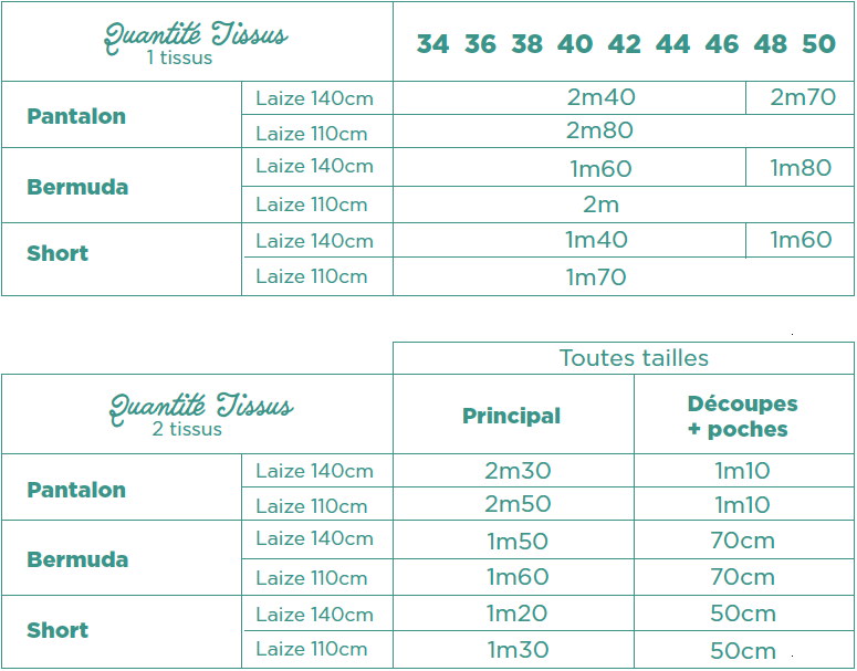 Le patron propose 2 hauteurs de taille (haute et mi haute), 3 longueurs (pantalon, bermuda & short) et en option, un joli pli nervure pour allonger la jambe.