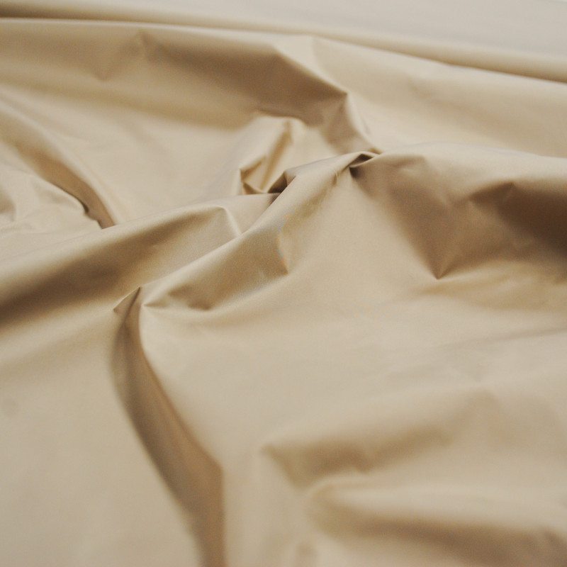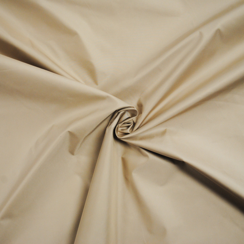 Tissu déperlant uni de couleur sable au touché "k-way" à la fois léger, souple et doux. Il est idéal pour la couture d'une veste estivale résistant à la pluie ou d'un petit sac pour ranger ses maillots ou affaires de toilette.