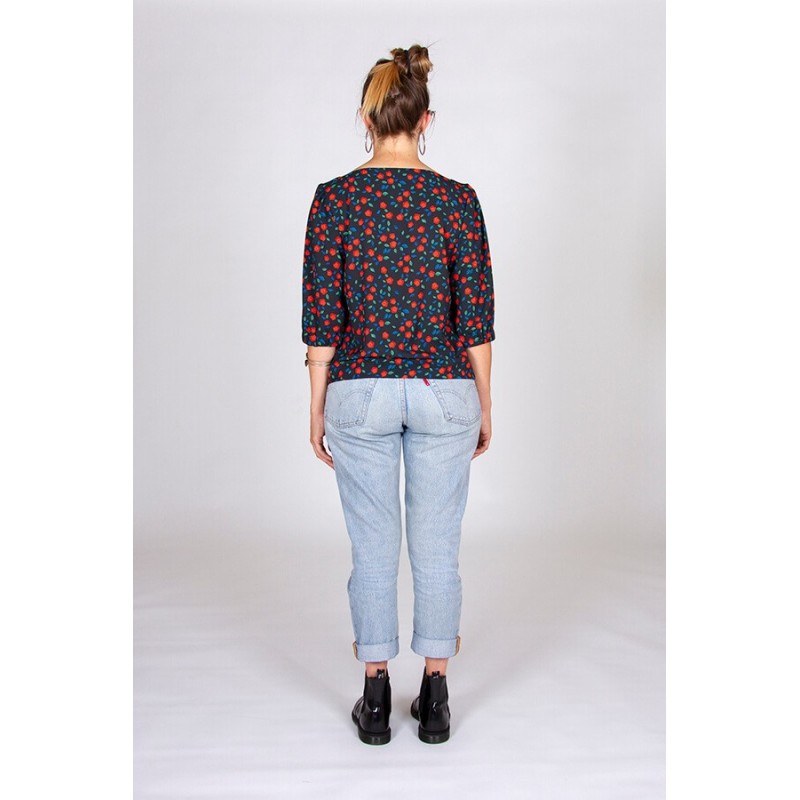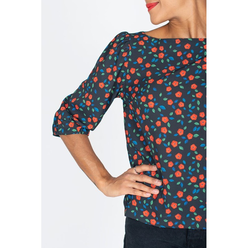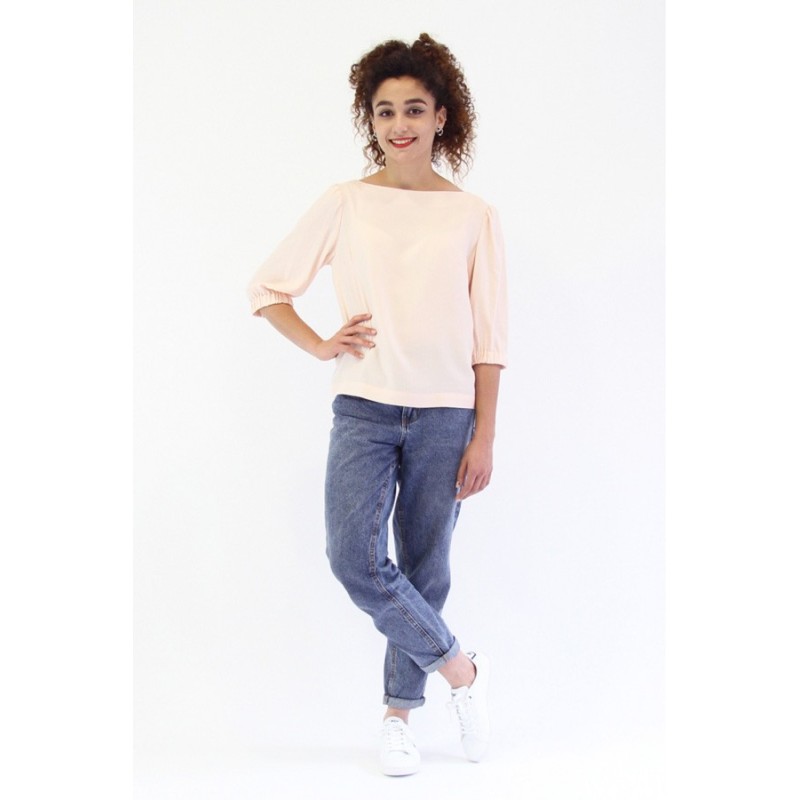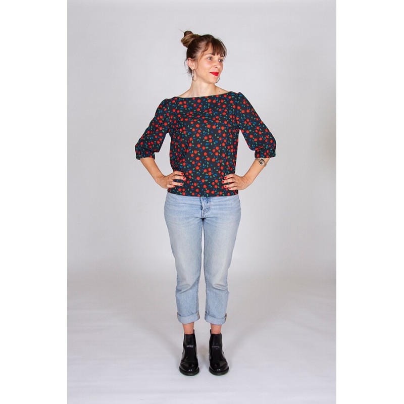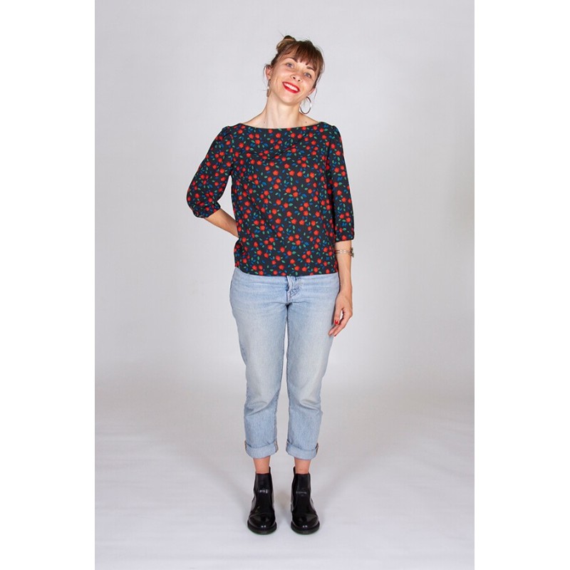 Je suis la blouse Joy, Joie incarnée. Mon enthousiasme n’a d’égal que ma volupté. Au premier regard, je suis sage et puis, enveloppé dans vos bras, je chavire d’enchantement. Je suis un haut en apparence simple mais, mon encolure bateau et mes manches froncées 3/4 me rendent audacieux.