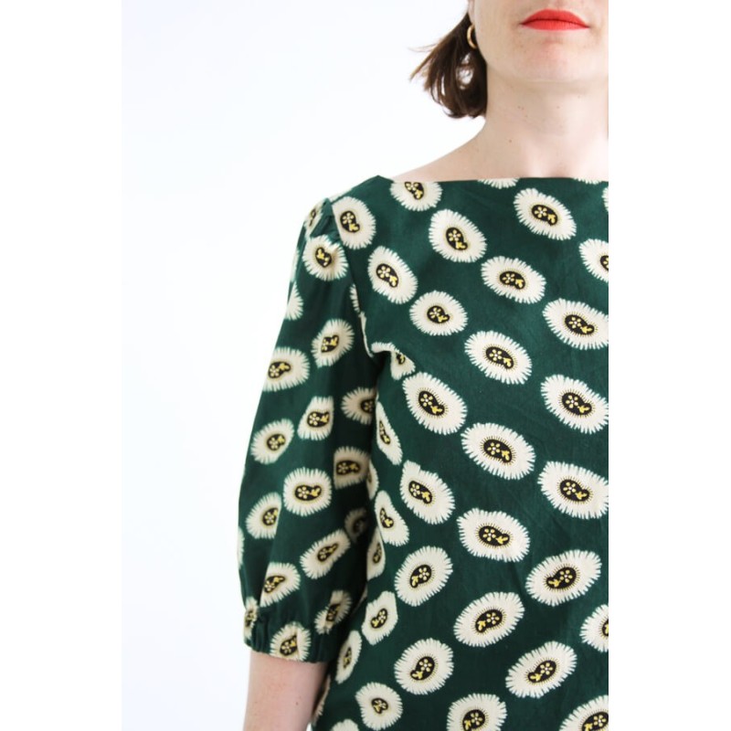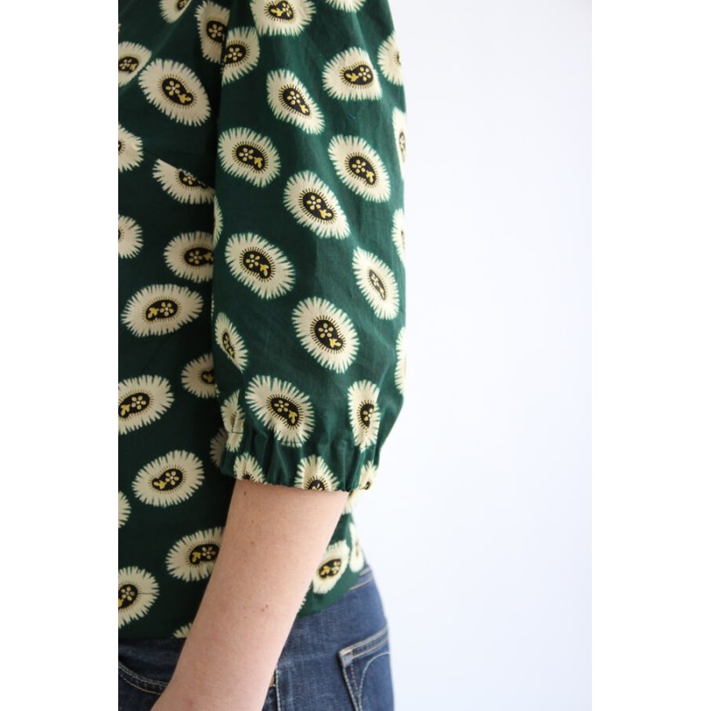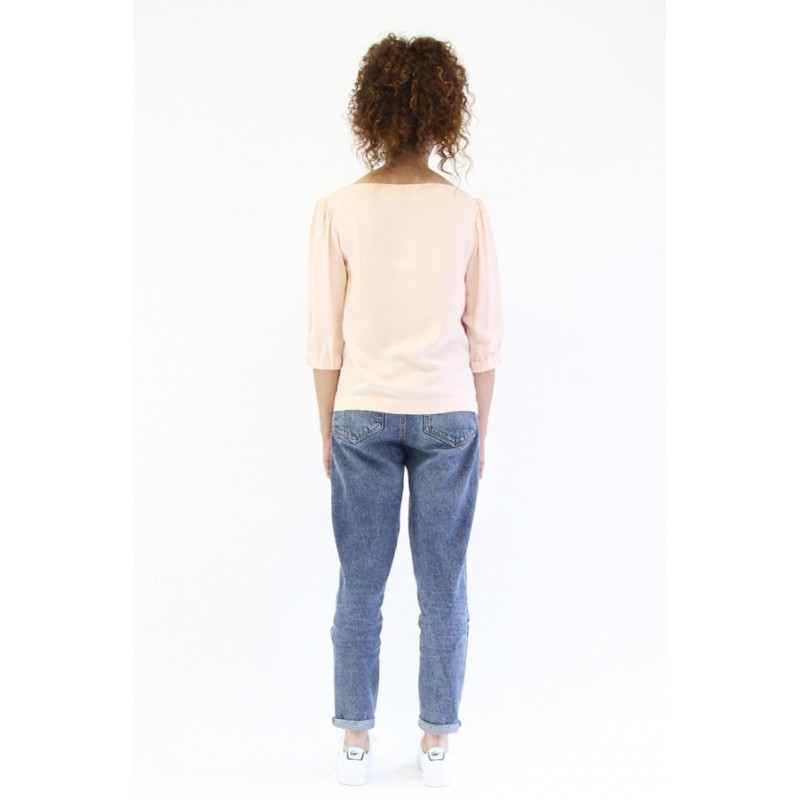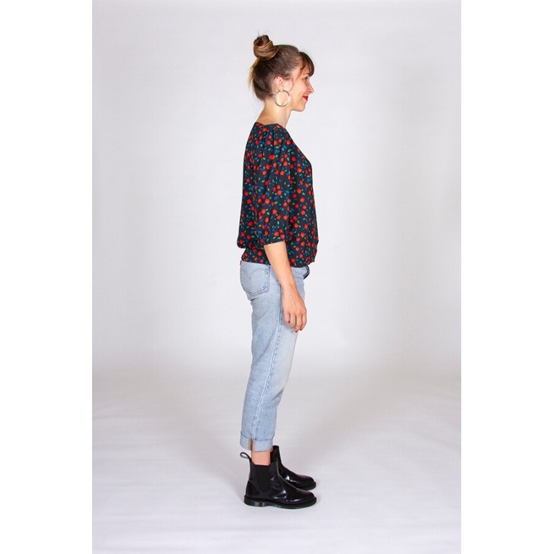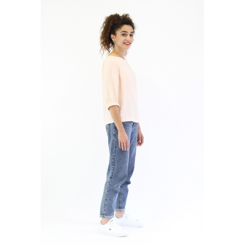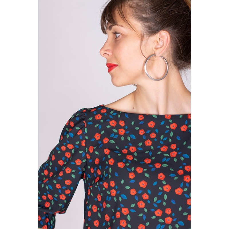 Je suis la blouse Joy, Joie incarnée. Mon enthousiasme n’a d’égal que ma volupté. Au premier regard, je suis sage et puis, enveloppé dans vos bras, je chavire d’enchantement. Je suis un haut en apparence simple mais, mon encolure bateau et mes manches froncées 3/4 me rendent audacieux.