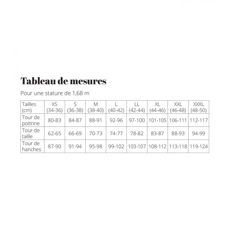 - Pour la version doublée : 125cm (XS), 140cm (S < LL) ou 165cm (XL < XXXL)