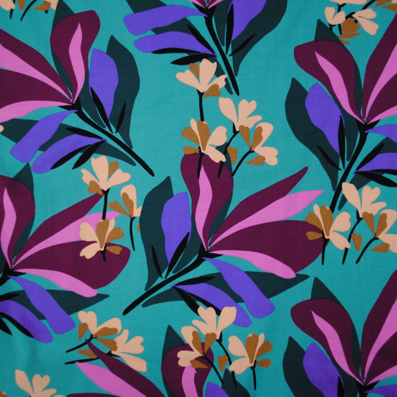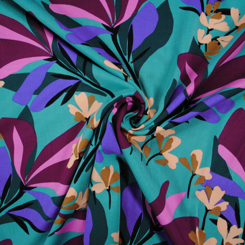 Belle viscose stretch au motif floral et végétal fuchsia, rose et violine sur un fond bleu canard. Au-delà de sa belle élasticité, le tissu est souple et doux, idéal pour la couture d'une robe, d'une jupe ou d'un top.