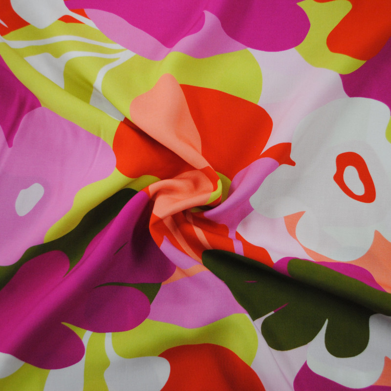 Viscose au motif de fleurs et végétaux aux couleurs vives de fuchsia, vert, rouge orangé, rose, saumon et crème. Léger et fluide, on imagine parfaitement un pantalon ample, un top ou une chemise.