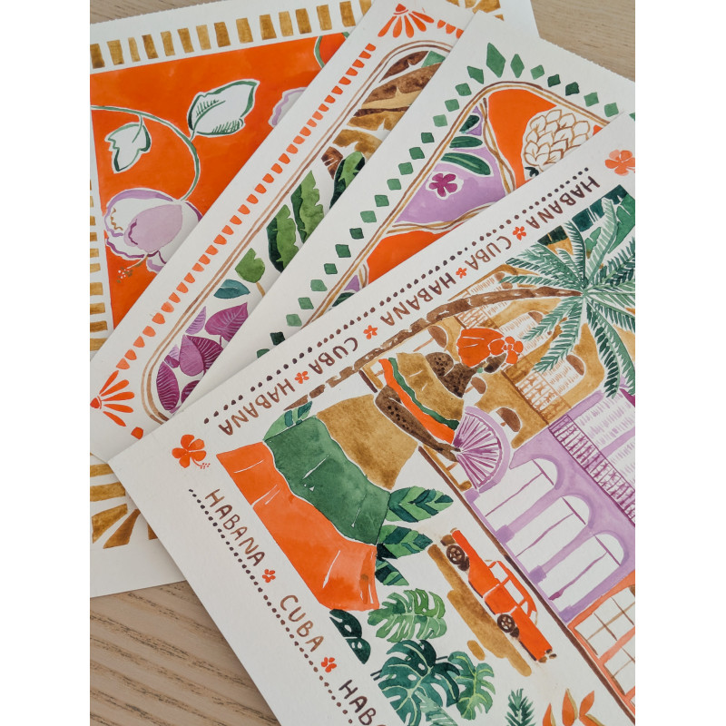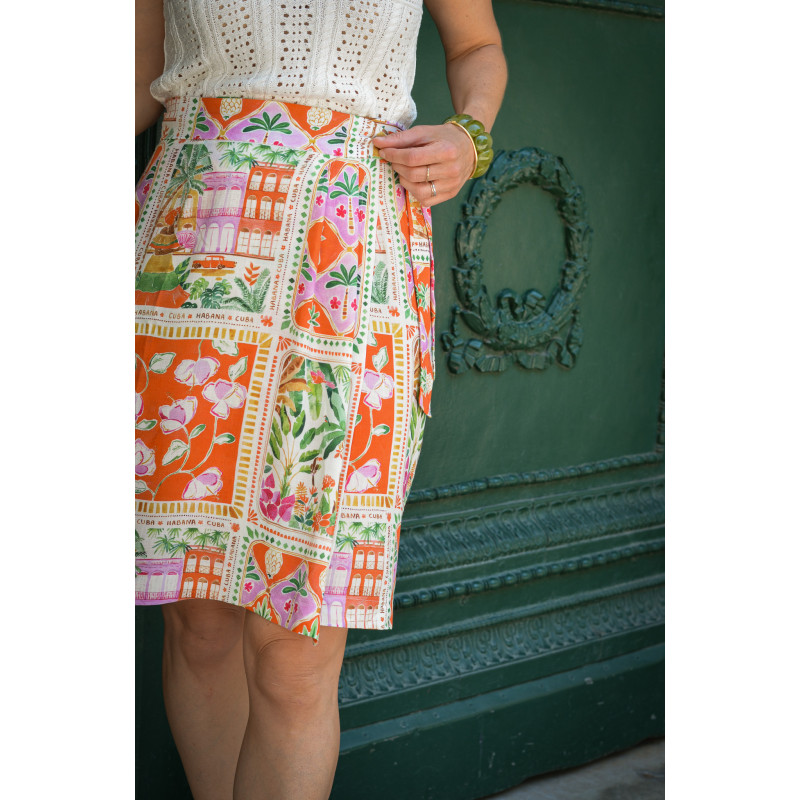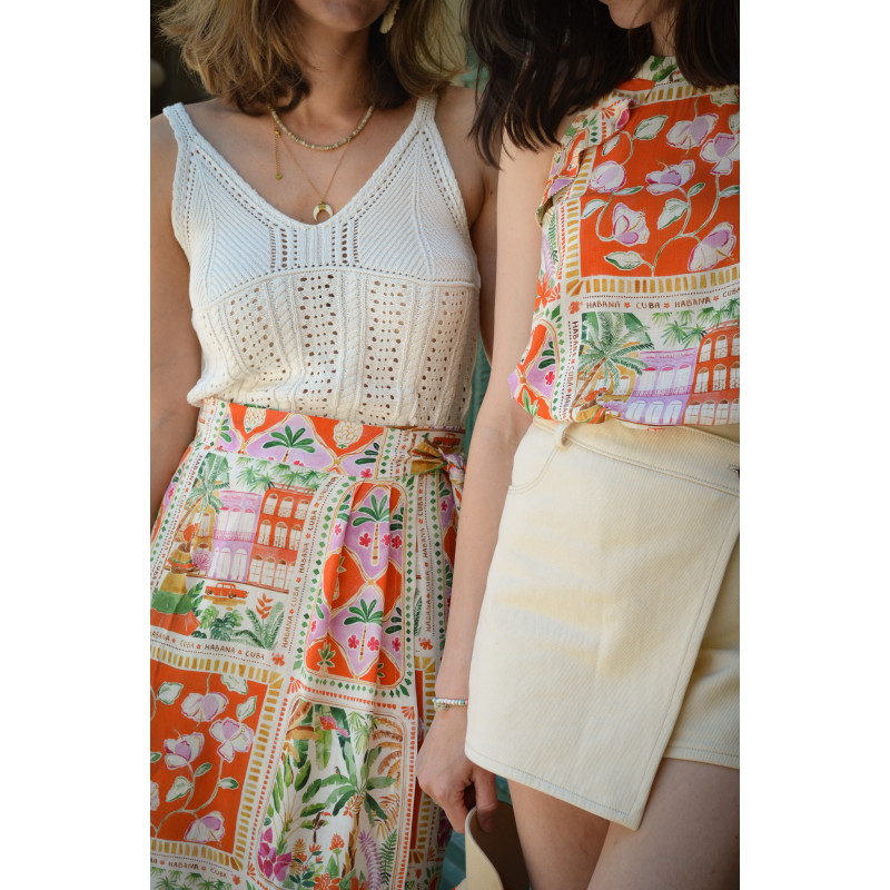 Azulejos est un belle viscose texturée de poids moyen offrant un magnifique drapé, une belle opacité tout en étant confortable pour une couture d'été ! Le motif signé @happy.watercolor vous transportera direction Cuba, en plein coeur de la Havane à travers ces différents panneaux.