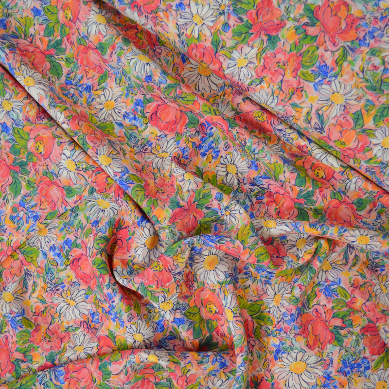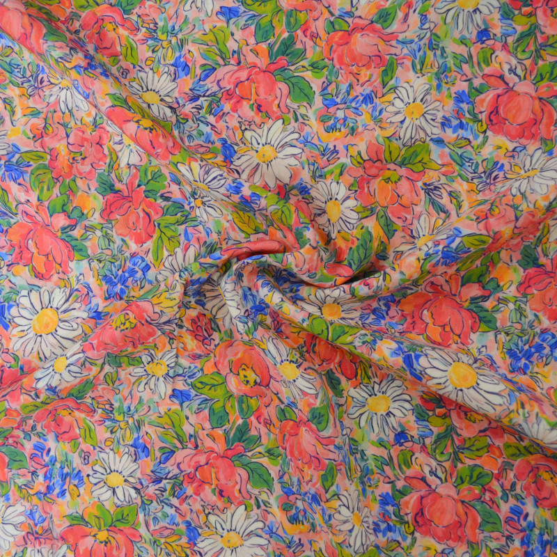 Viscose Lenzing Ecovero au motif floral chargé de fleurs rouges, blanches/jaunes, bleues et de feuillage vert sur un fond rose. Un tissu doux et fluide qui se déclinera parfaitement en blouses, robes, jupes ou foulards.