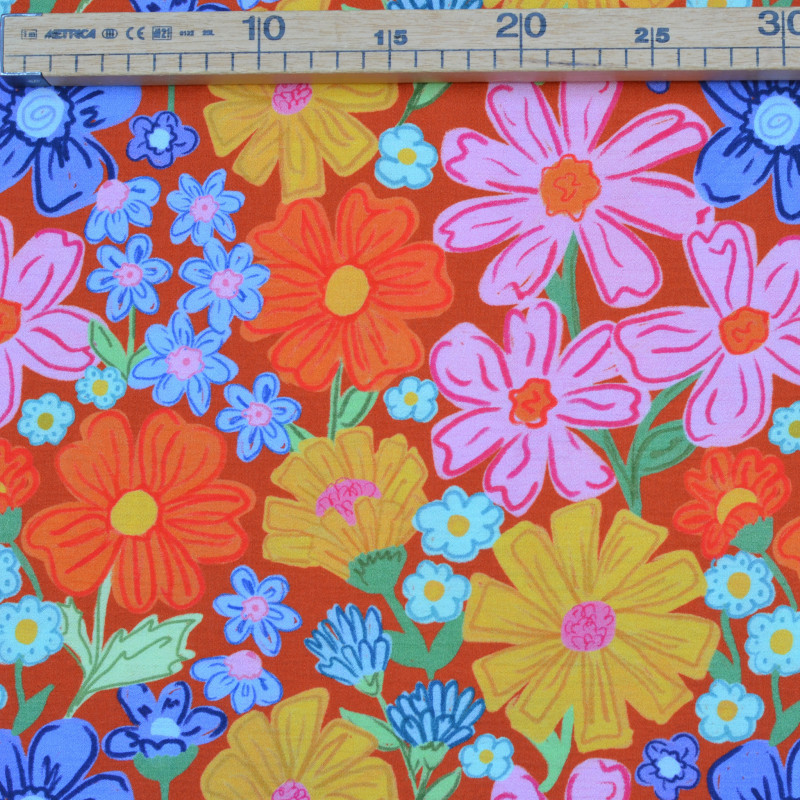 Viscose texturée au motif floral exclusif de grandes fleurs jaunes, oranges, bleues et vertes sur un fond orange. Un motif aussi vif que rafraichissant, avec un tombé de dingue et une douceur incroyable. Ce tissu vous permet d'imaginer de nombreuses pièces telles que des robes, tops, chemises, pantalons larges et accessoires.