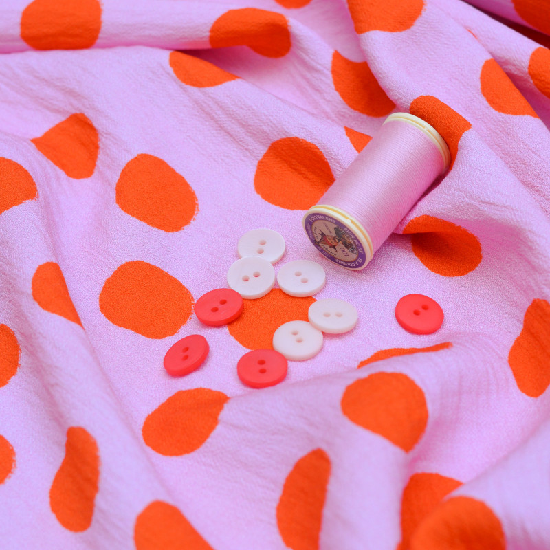 Viscose texturée au motif à pois oranges sur un fond rose. Un motif pop et dynamique, avec un tombé de dingue et une douceur incroyable. Ce tissu vous permet d'imaginer de nombreuses pièces telles que des robes, tops, chemises, pantalons larges et accessoires.